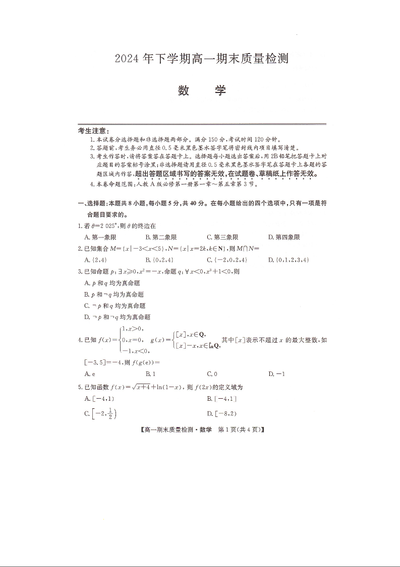 湖南省炎德英才名校联合体2024-2025学年高一上学期期末联考数学
