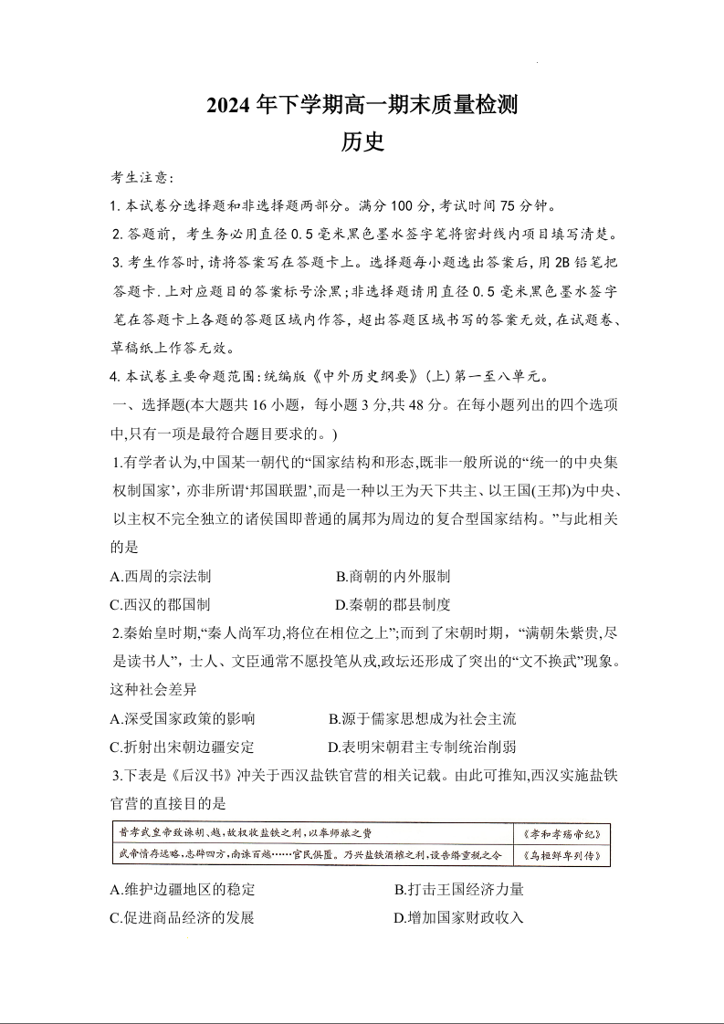 湖南省炎德英才名校联合体2024-2025学年高一上学期期末联考历史