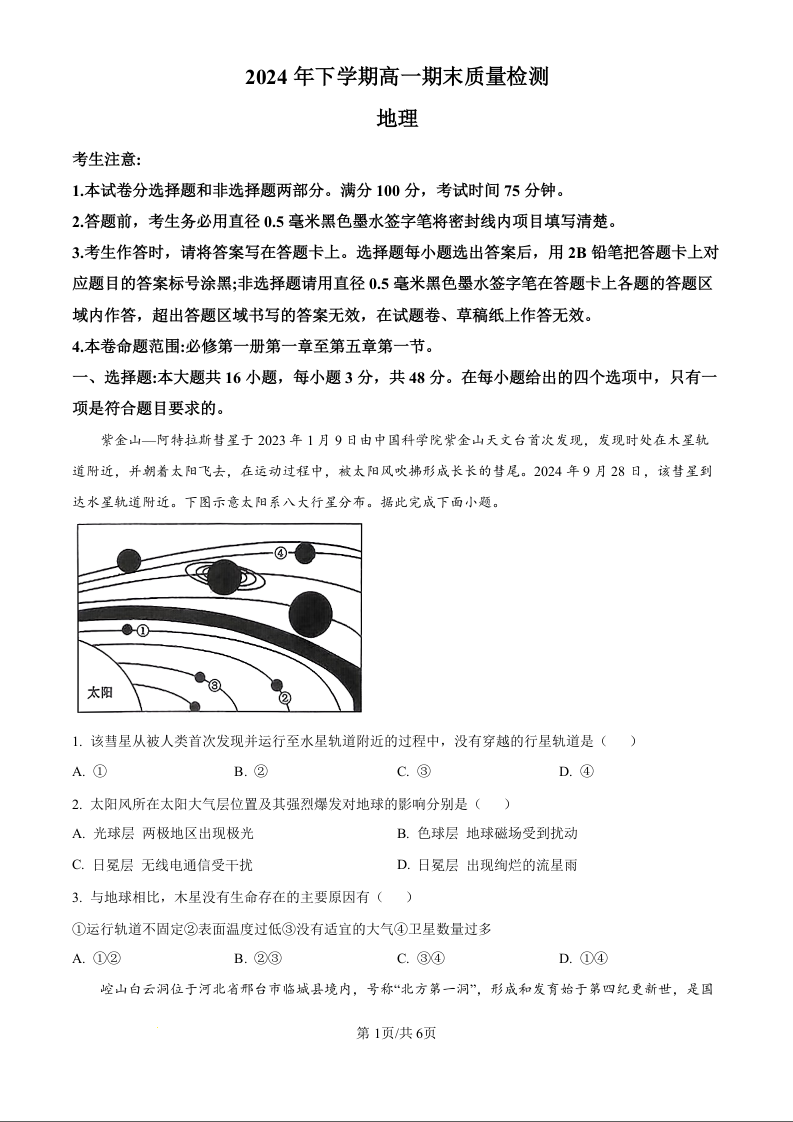 湖南省炎德英才名校联合体2024-2025学年高一上学期期末联考地理(原卷版)