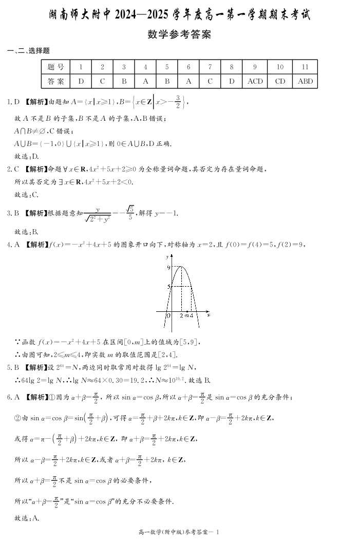 湖南师范大学附属中学2024-2025学年高一上学期1月期末数学答案