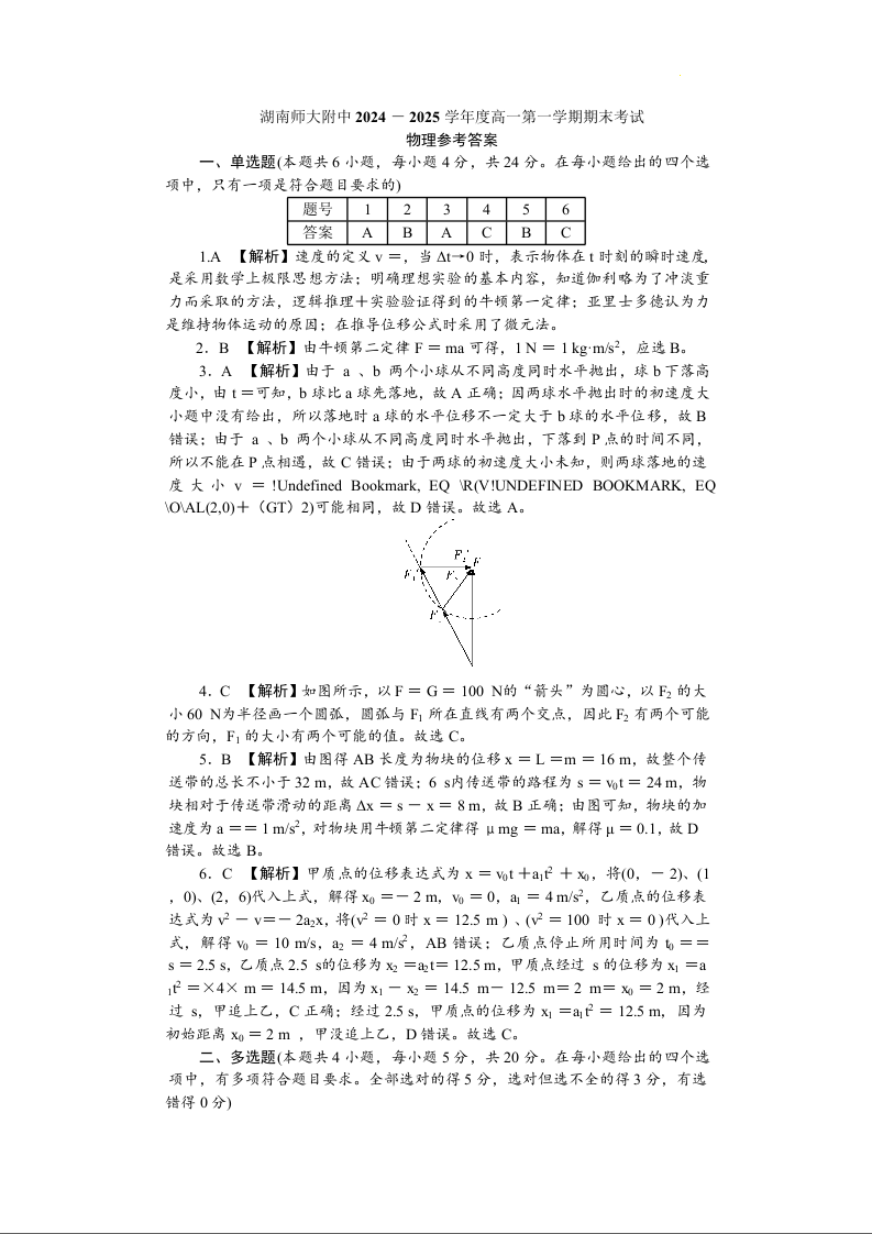 湖南师范大学附属中学2024-2025学年高一上学期1月期末物理答案