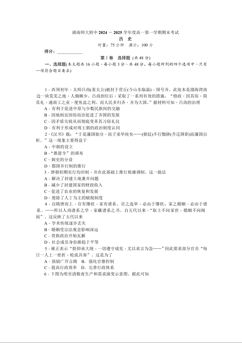 湖南师范大学附属中学2024-2025学年高一上学期1月期末历史