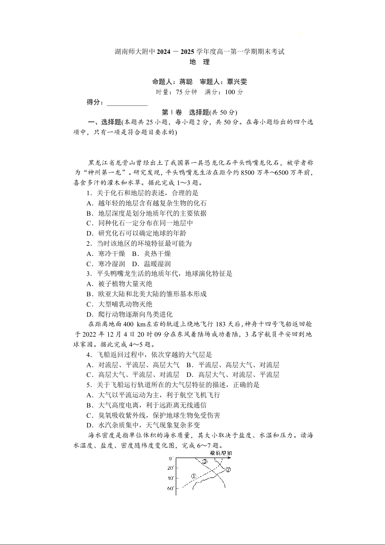 湖南师范大学附属中学2024-2025学年高一上学期1月期末地理