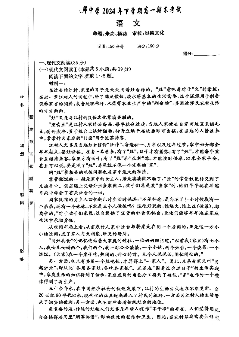 湖南省长沙市长郡中学2024-2025学年高一上学期期末考试语文