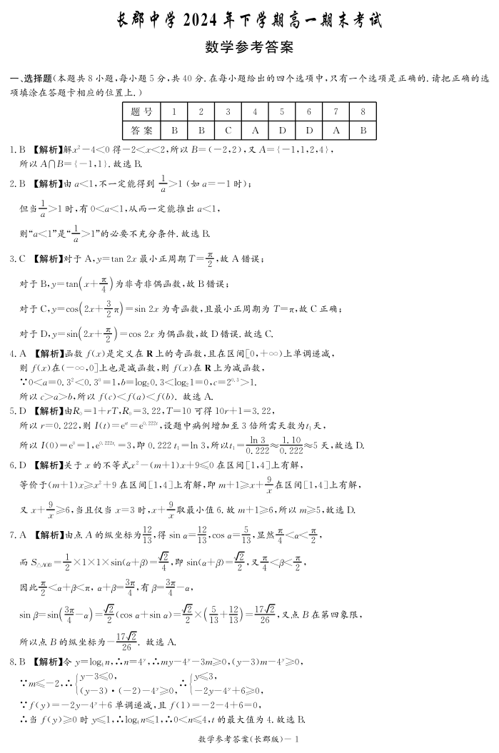 湖南省长沙市长郡中学2024-2025学年高一上学期期末考试数学答案