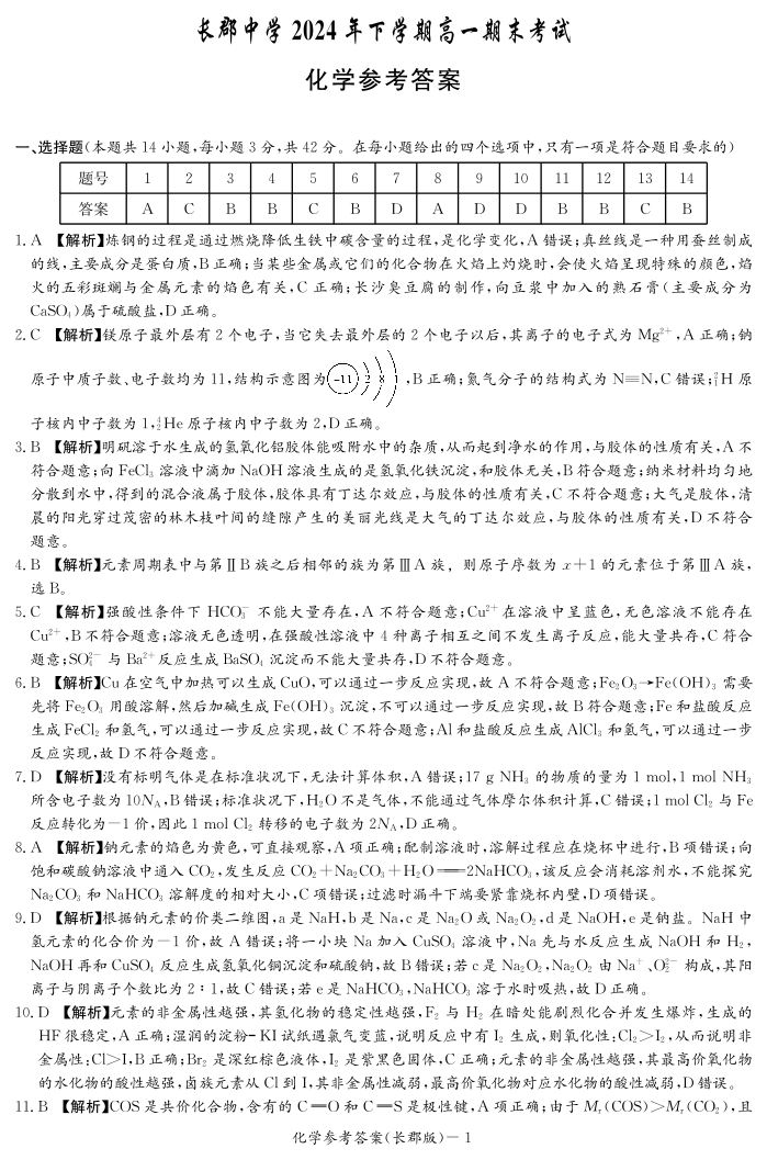 湖南省长沙市长郡中学2024-2025学年高一上学期期末考试化学答案