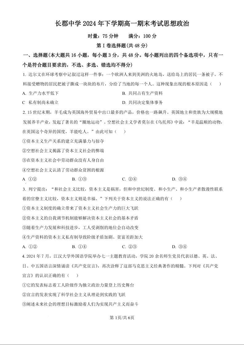 湖南省长沙市长郡中学2024-2025学年高一上学期期末考试政治(原卷版)