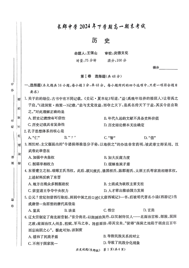 湖南省长沙市长郡中学2024-2025学年高一上学期期末考试历史