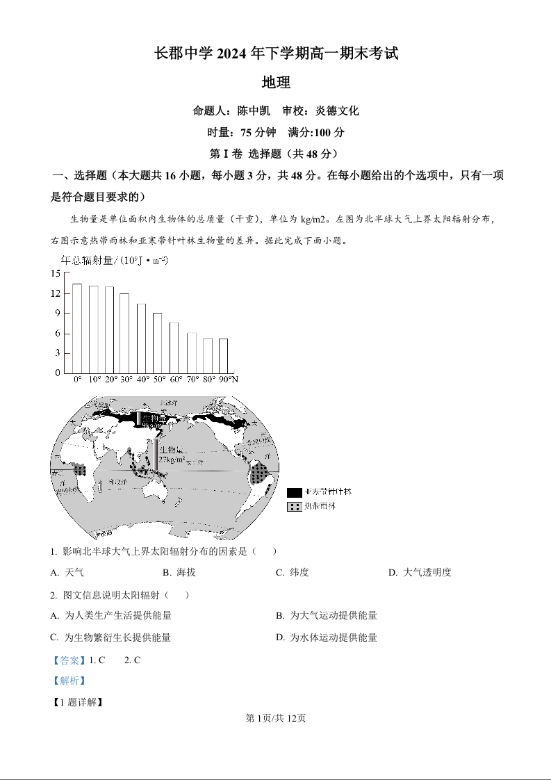湖南省长沙市长郡中学2024-2025学年高一上学期期末考试地理(精品解析版)