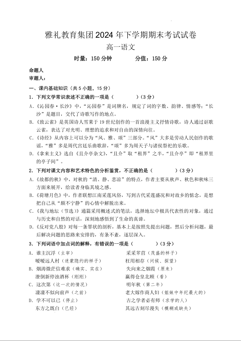 湖南省长沙市雅礼中学2024-2025学年高一上学期期末考试语文