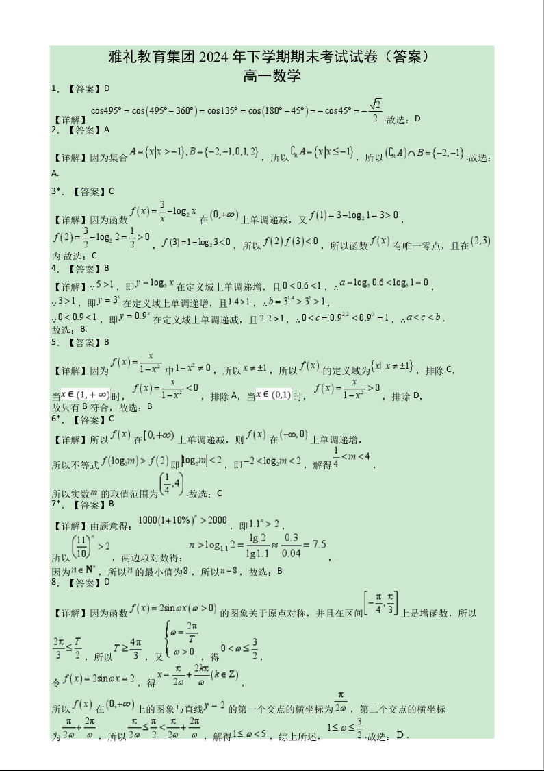 湖南省长沙市雅礼中学2024-2025学年高一上学期期末考试试数学答案