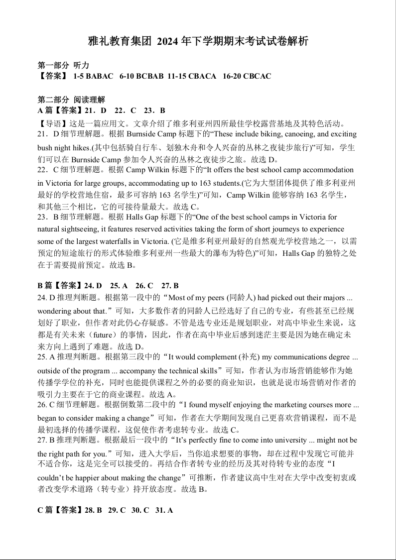 湖南省长沙市雅礼中学2024-2025学年高一上学期期末考试英语答案