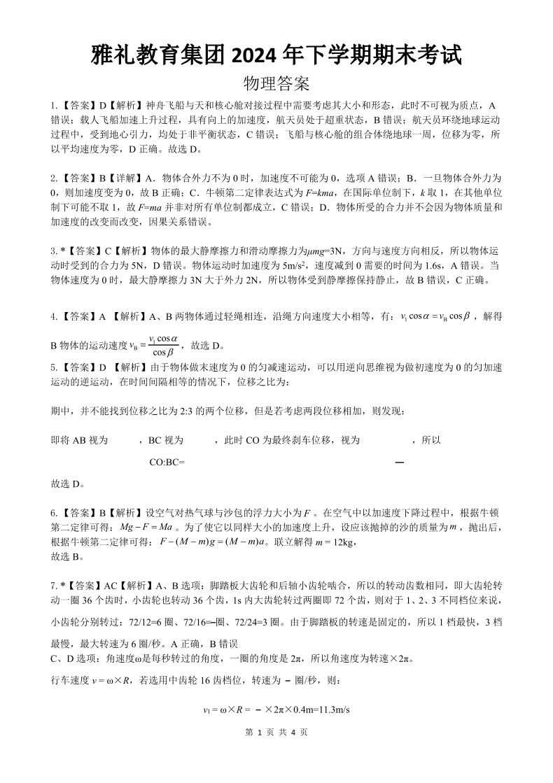 湖南省长沙市雅礼中学2024-2025学年高一上学期期末考试物理答案