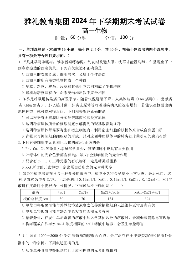 湖南省长沙市雅礼中学2024-2025学年高一上学期期末考试生物
