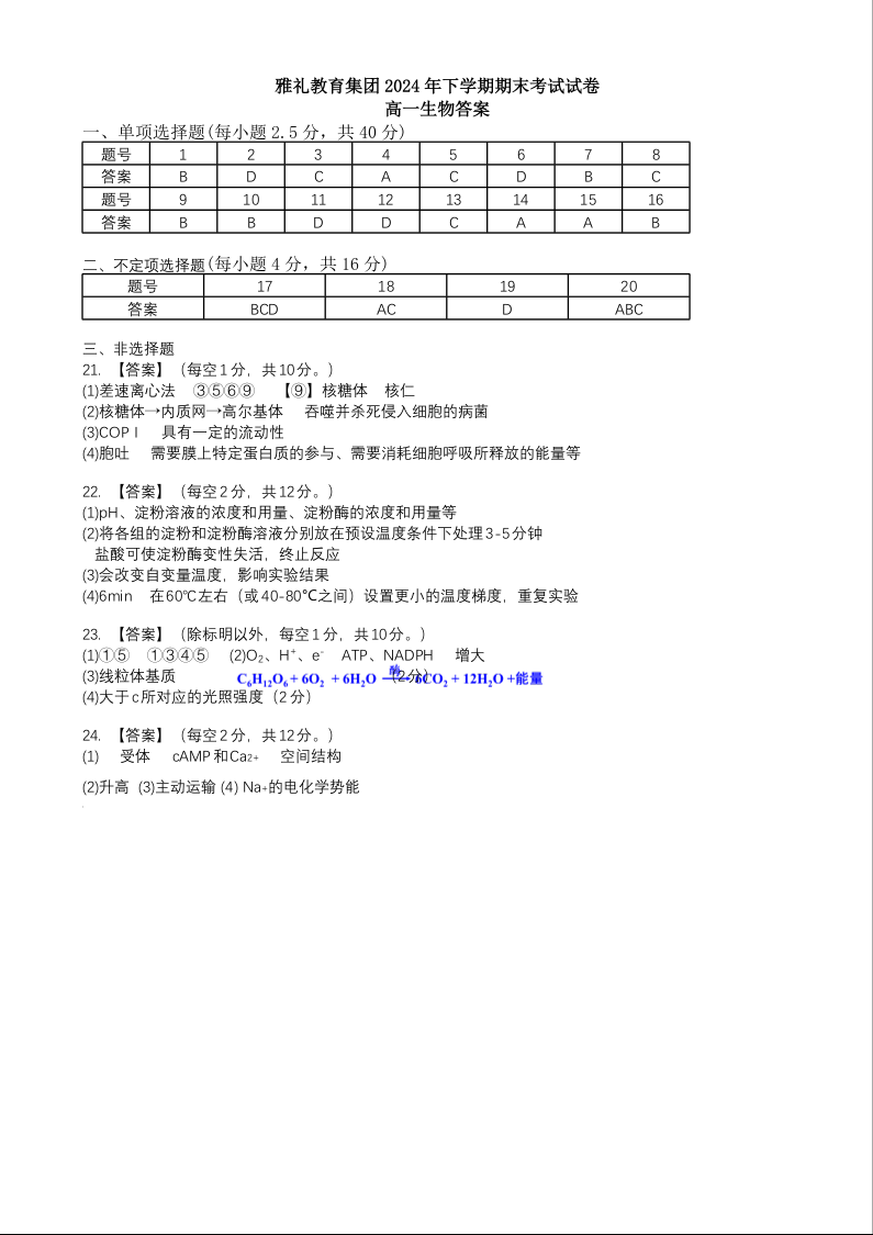 湖南省长沙市雅礼中学2024-2025学年高一上学期期末考试生物答案