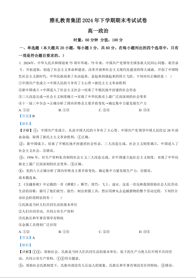 湖南省长沙市雅礼中学2024-2025学年高一上学期期末考试政治(精品解析版)