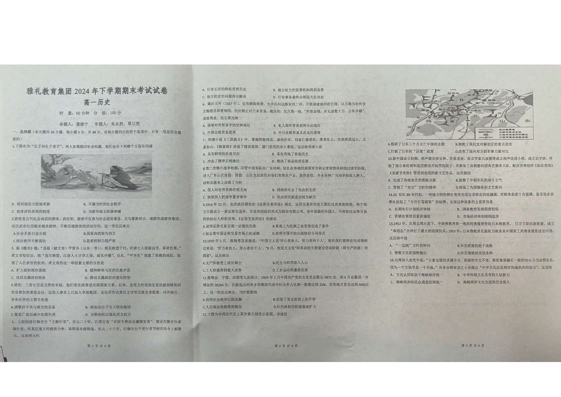 湖南省长沙市雅礼中学2024-2025学年高一上学期期末考试历史
