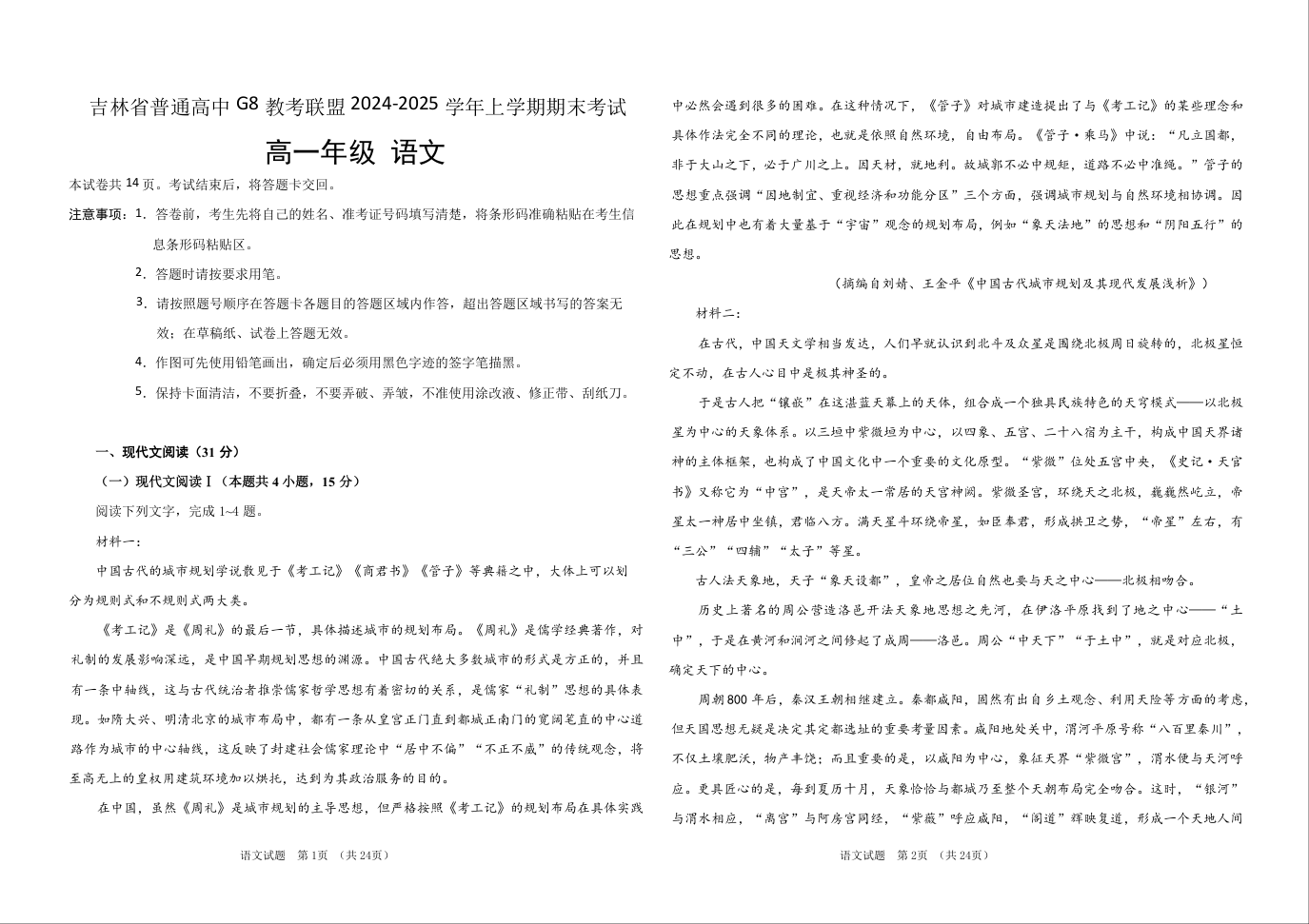 吉林省普通高中G8教考联盟2024-2025学年高一上学期期末考试语文+答案