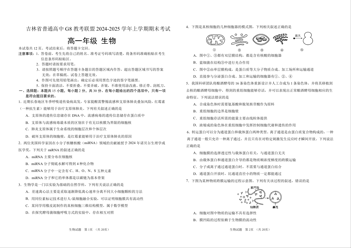 吉林省普通高中G8教考联盟2024-2025学年高一上学期期末考试生物+答案