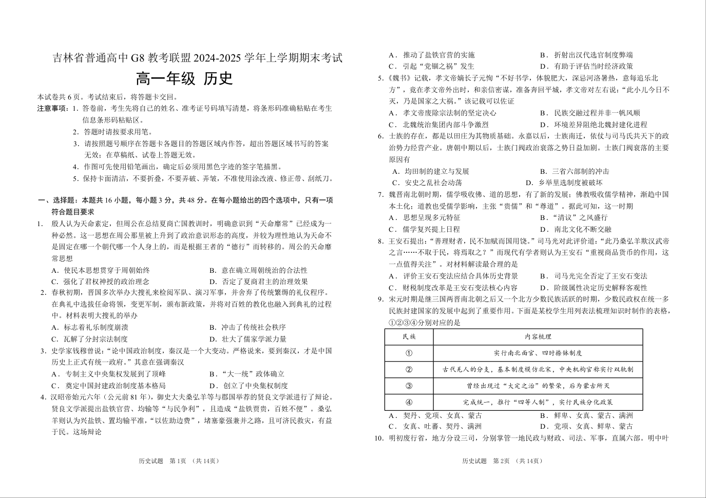 吉林省普通高中G8教考联盟2024-2025学年高一上学期期末考试历史+答案