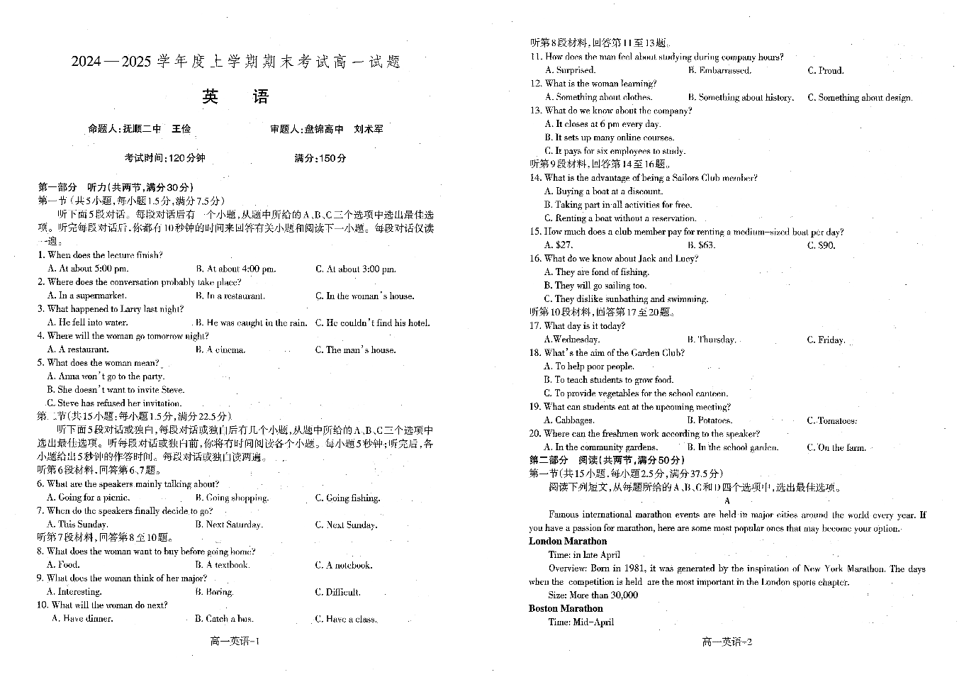辽宁省重点中学协作校2024-2025学年高一上学期1月期末联考英语