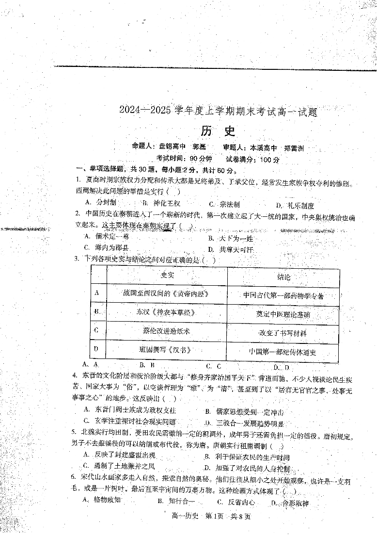 辽宁省重点中学协作校2024-2025学年高一上学期1月期末联考历史