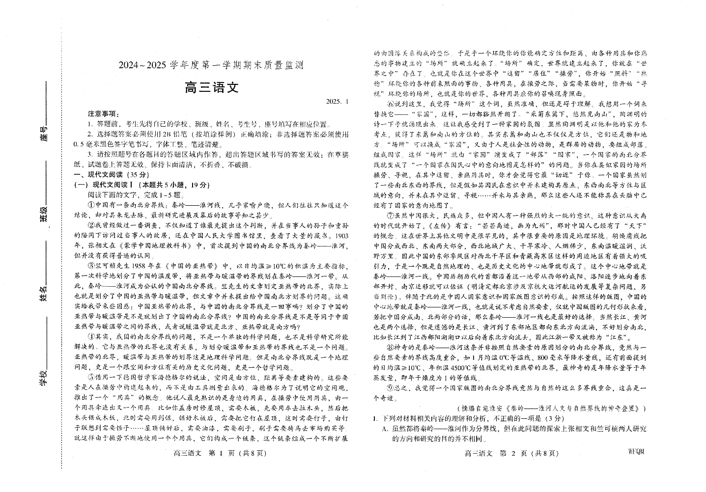 山东省潍坊市2024-2025学年第一学期高三期末考试语文