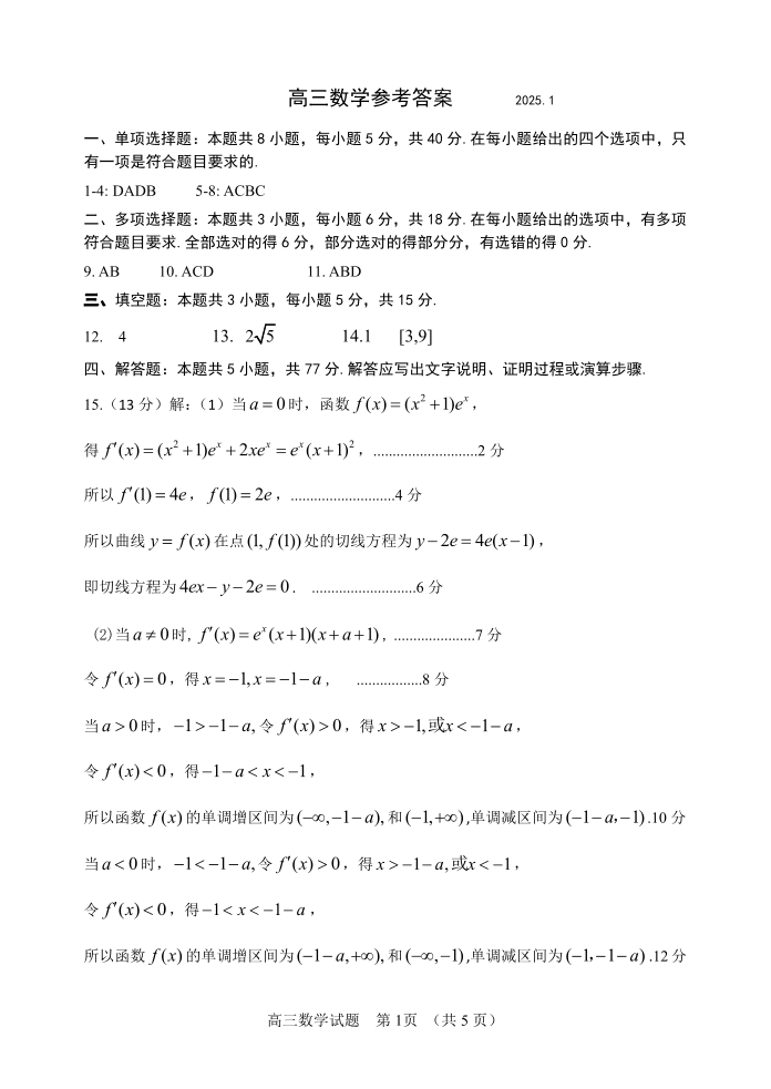 山东省潍坊市2024-2025学年第一学期高三期末考试数学答案