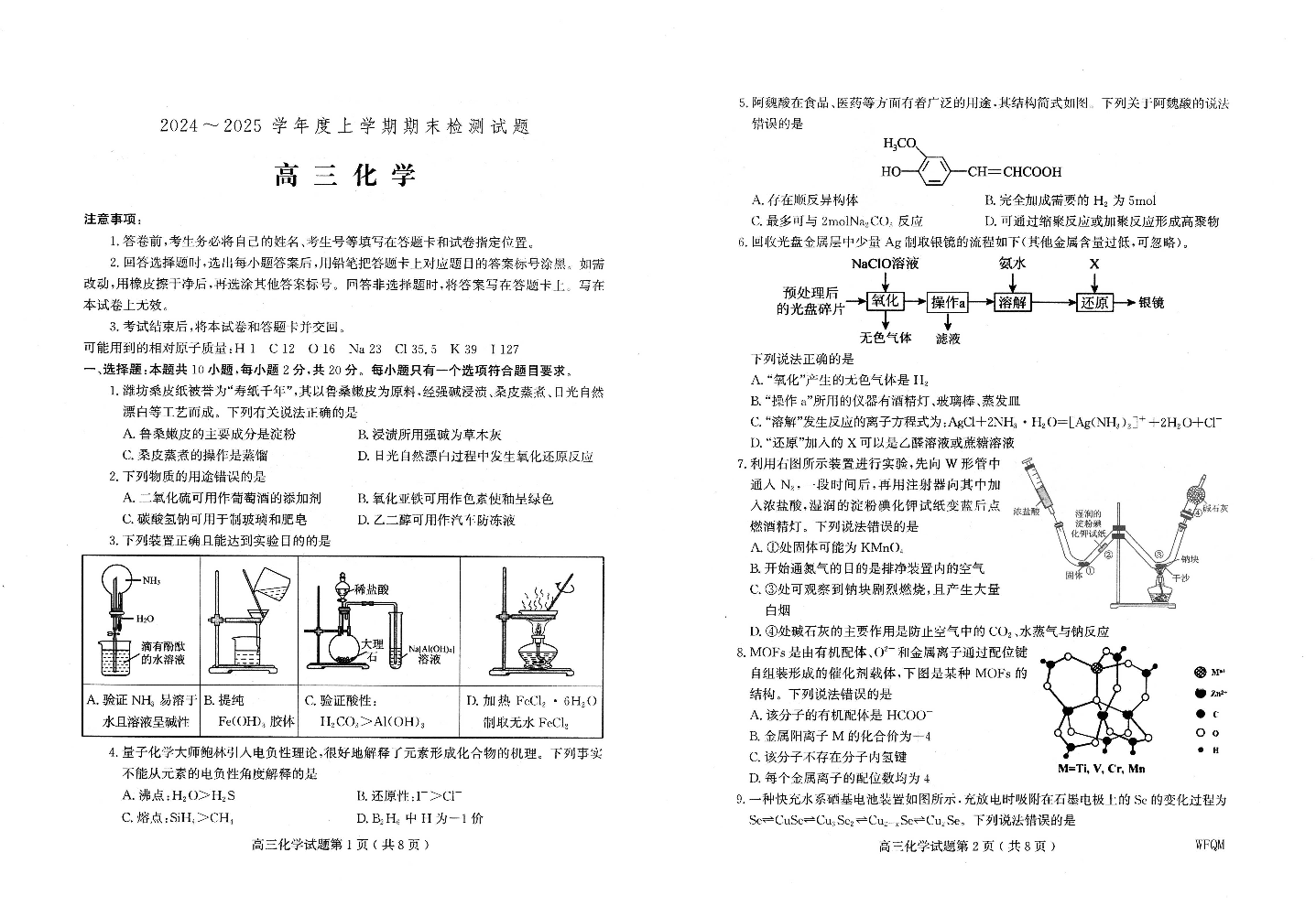 山东省潍坊市2024-2025学年第一学期高三期末考试化学