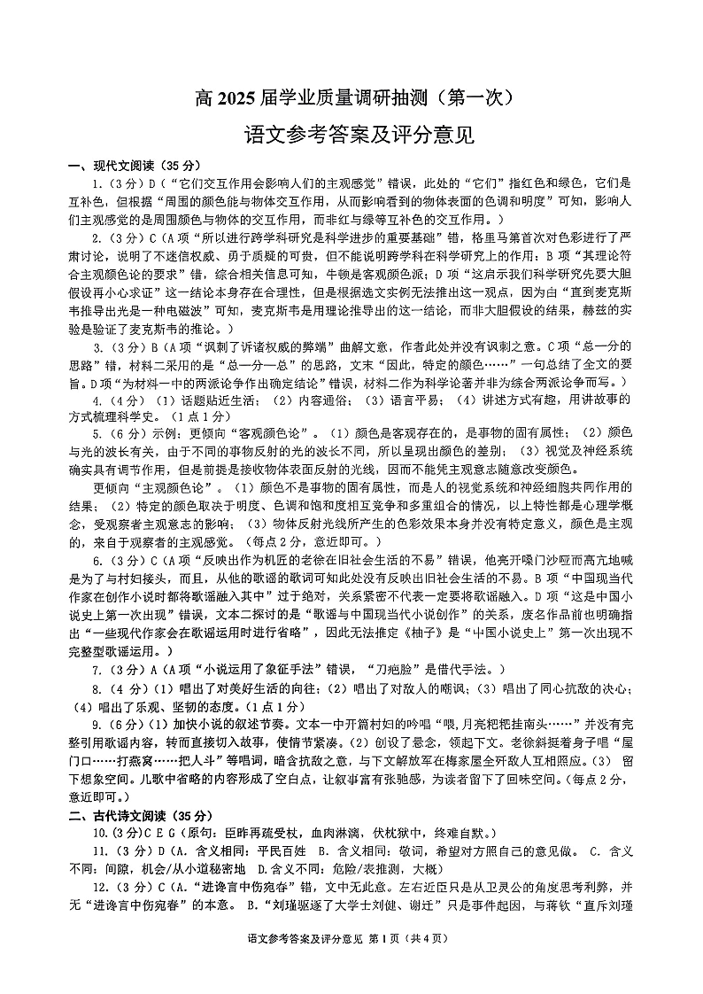 重庆市主城区2024-2025学年1月高三期末学业质量调研语文答案