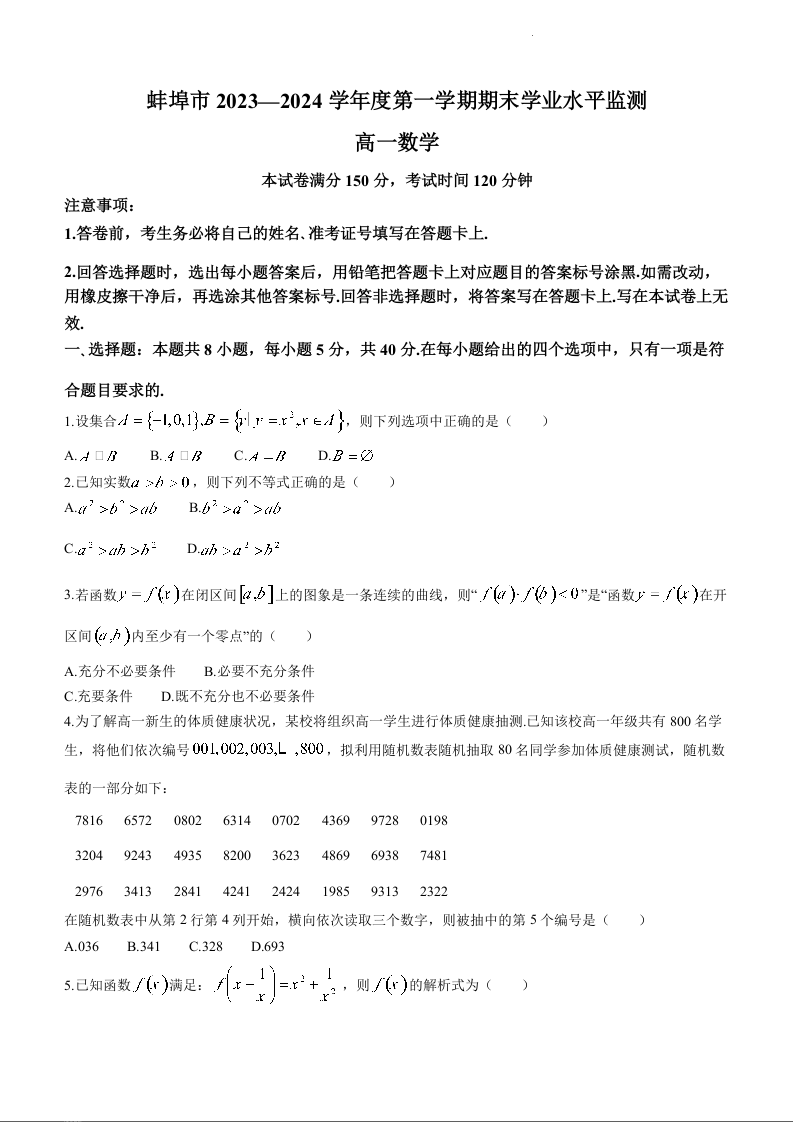 安徽省蚌埠市2023-2024学年高一上学期期末考试数学