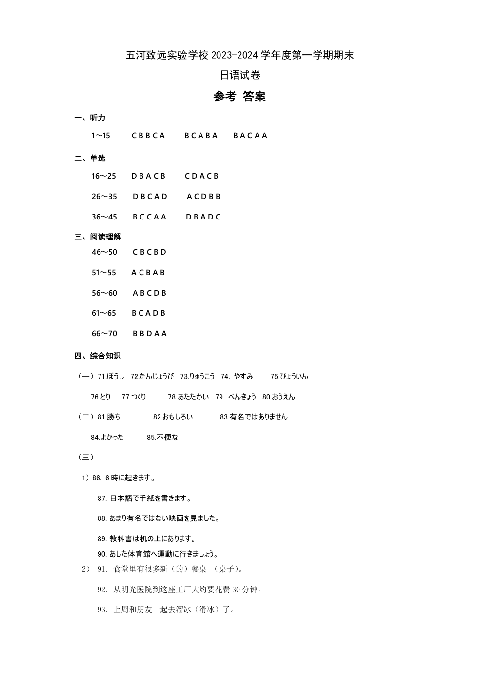 安徽省蚌埠市2023-2024学年高一上学期期末考试日语答案