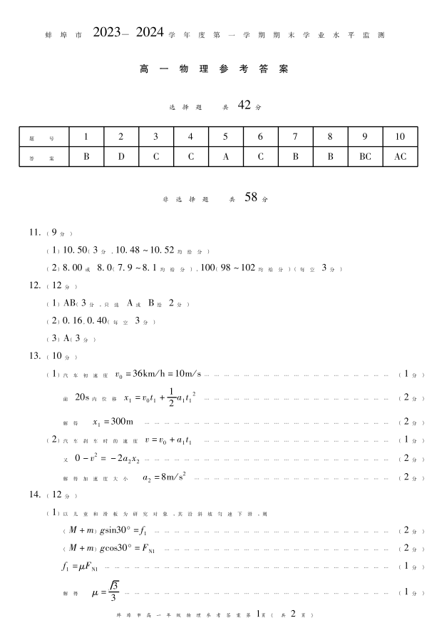 安徽省蚌埠市2023-2024学年高一上学期期末考试物理答案