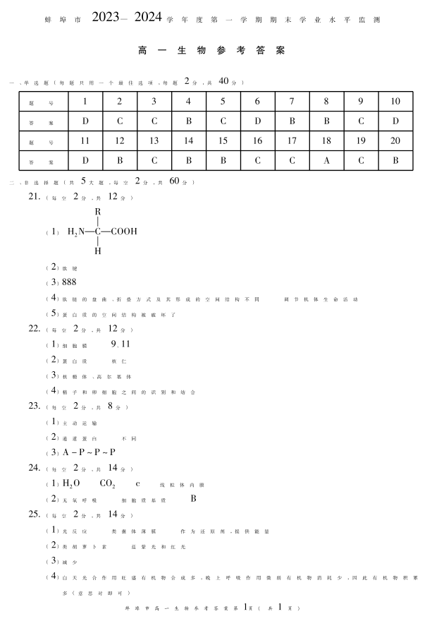 安徽省蚌埠市2023-2024学年高一上学期期末考试生物答案