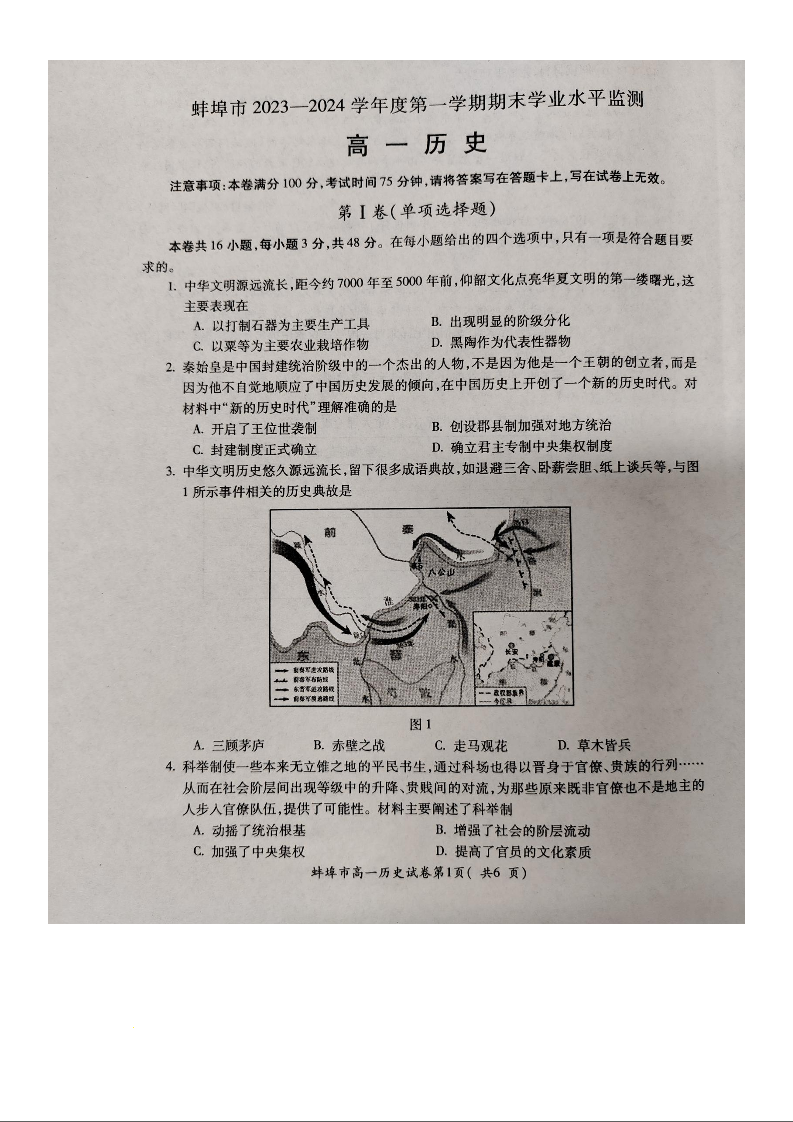 安徽省蚌埠市2023-2024学年高一上学期期末考试历史
