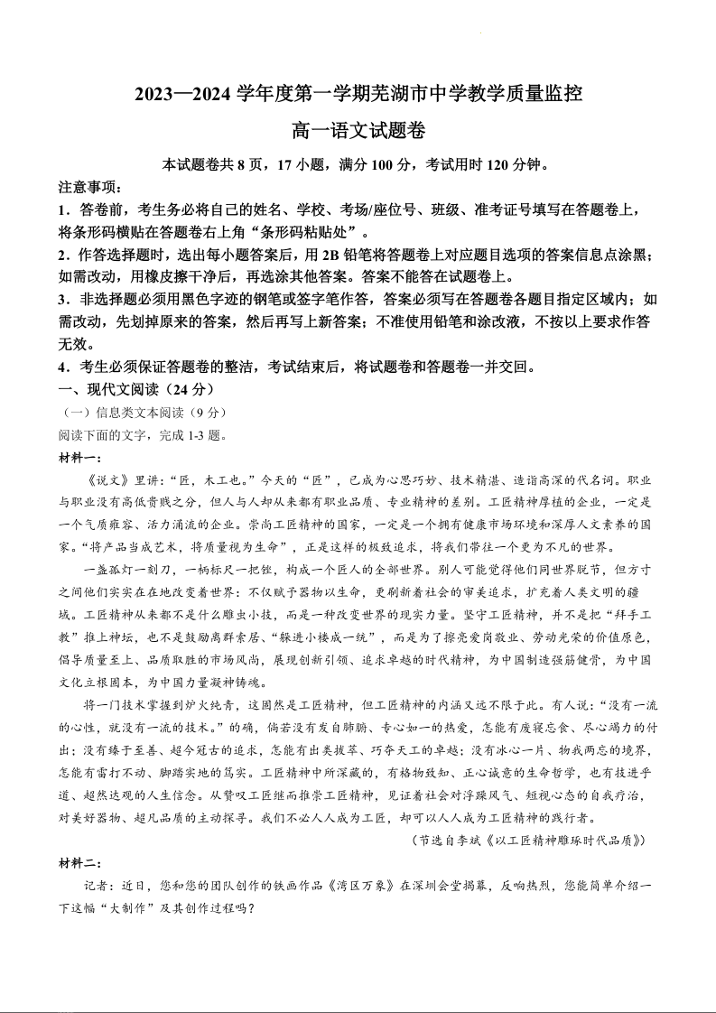 安徽省芜湖市2023-2024学年高一上学期期末考试语文