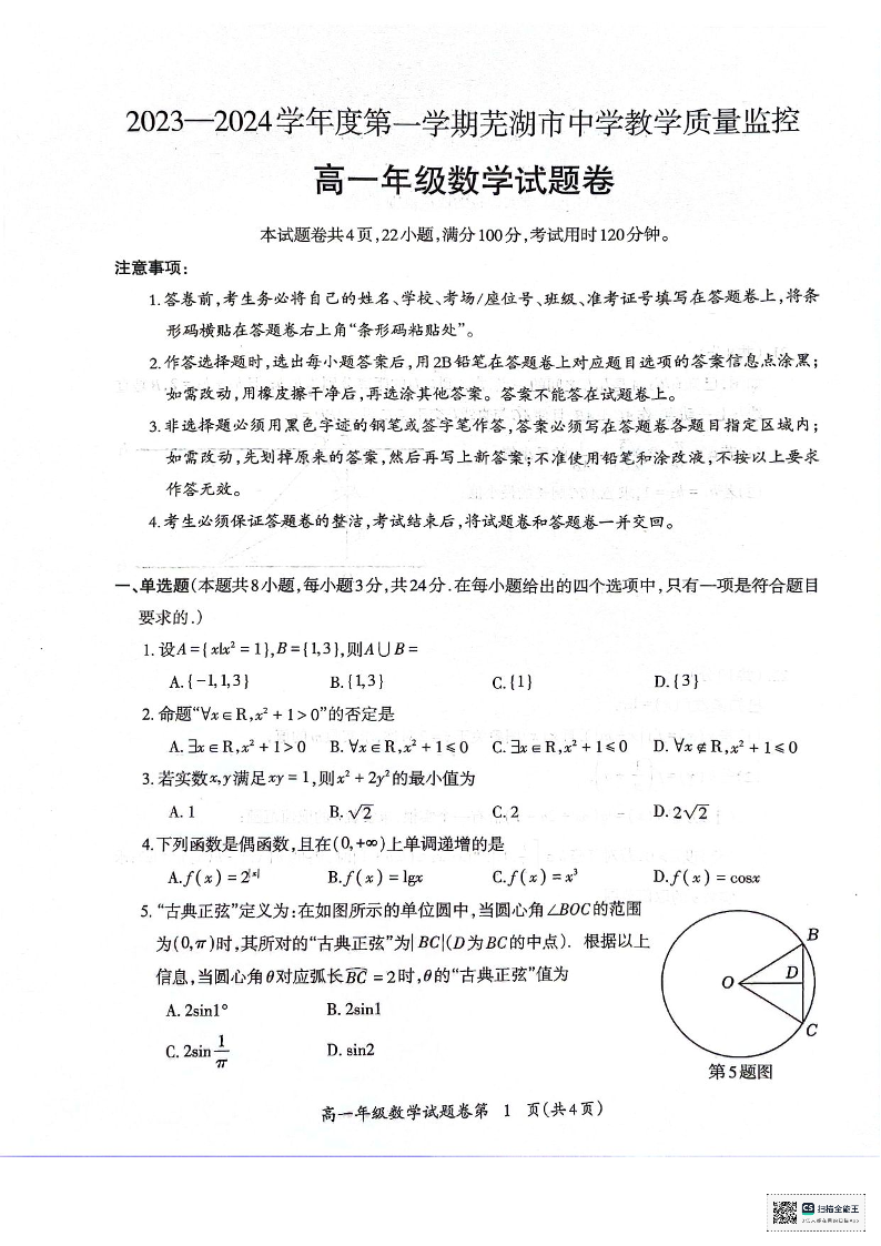 安徽省芜湖市2023-2024学年高一上学期期末考试数学