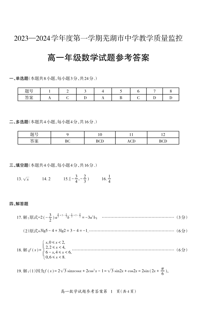 安徽省芜湖市2023-2024学年高一上学期期末考试数学答案