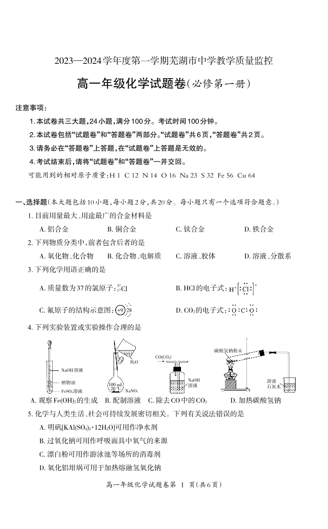 安徽省芜湖市2023-2024学年高一上学期期末考试化学
