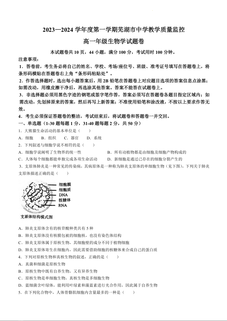 安徽省芜湖市2023-2024学年高一上学期期末考试生物