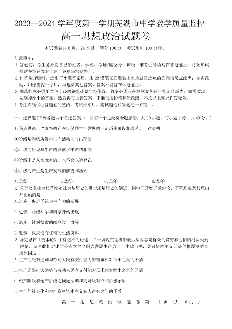 安徽省芜湖市2023-2024学年高一上学期期末考试政治