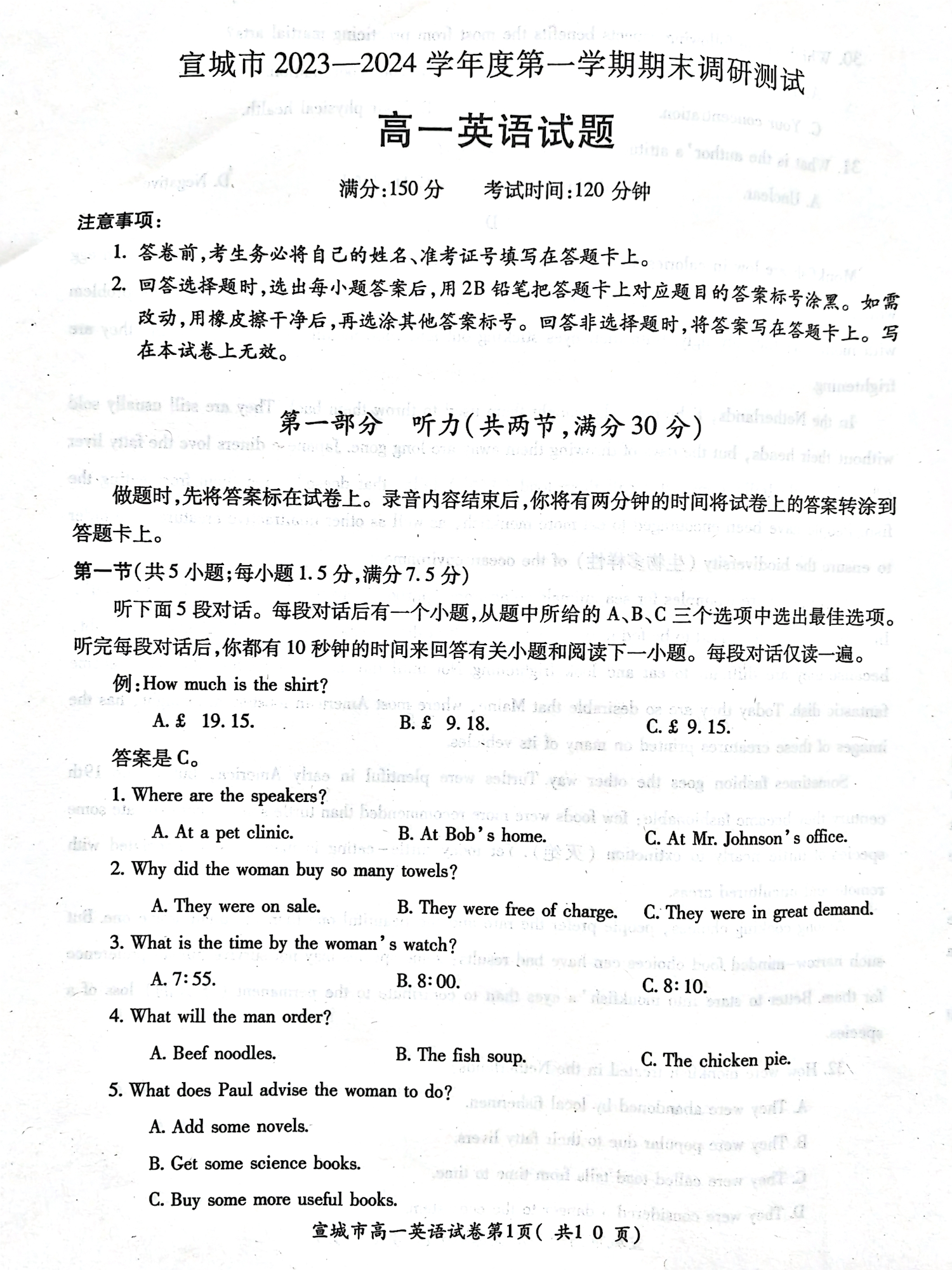 安徽省宣城市2023-2024学年高一上学期1月期末考试英语