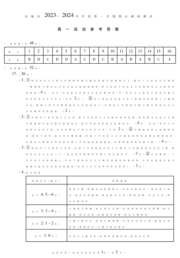 安徽省宣城市2023-2024学年高一上学期1月期末考试政治答案