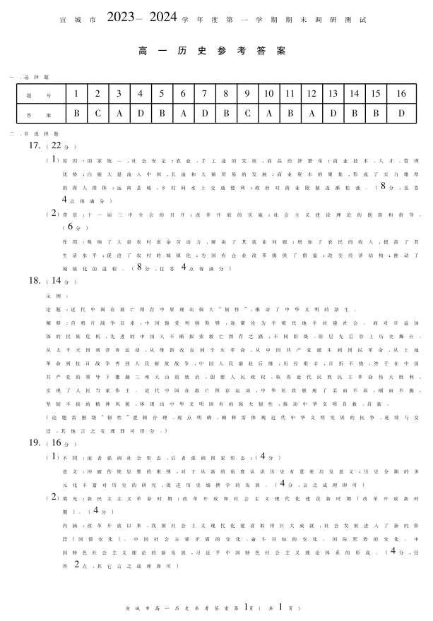 安徽省宣城市2023-2024学年高一上学期1月期末考试历史答案
