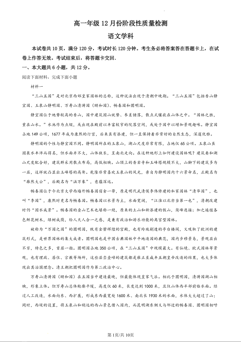 北京市海淀区首都师范大学附属中学2023-2024学年高一上学期12月月考语文(原卷版)