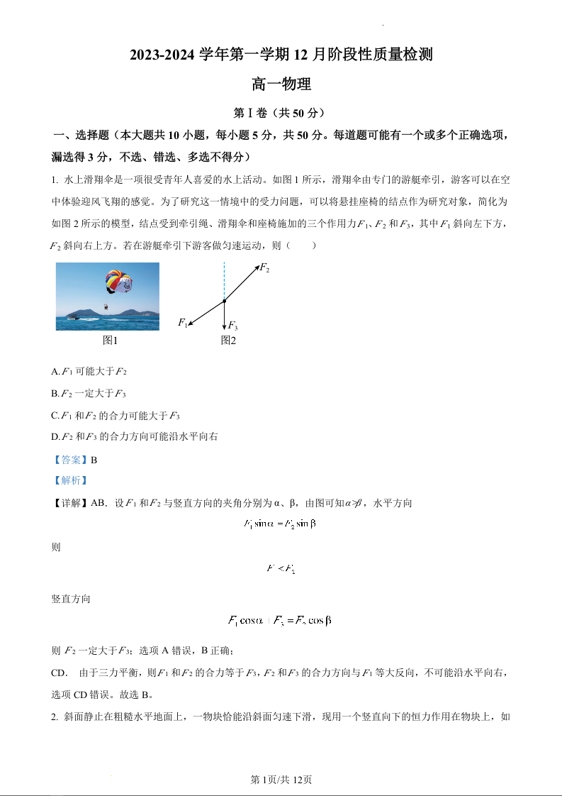 北京市海淀区首都师范大学附属中学2023-2024学年高一上学期12月月考物理(精品解析版)