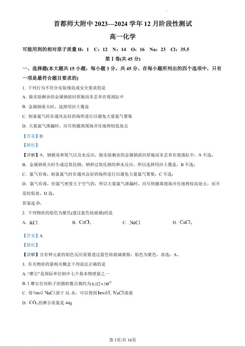 北京市海淀区首都师范大学附属中学2023-2024学年高一上学期12月月考化学(精品解析版)