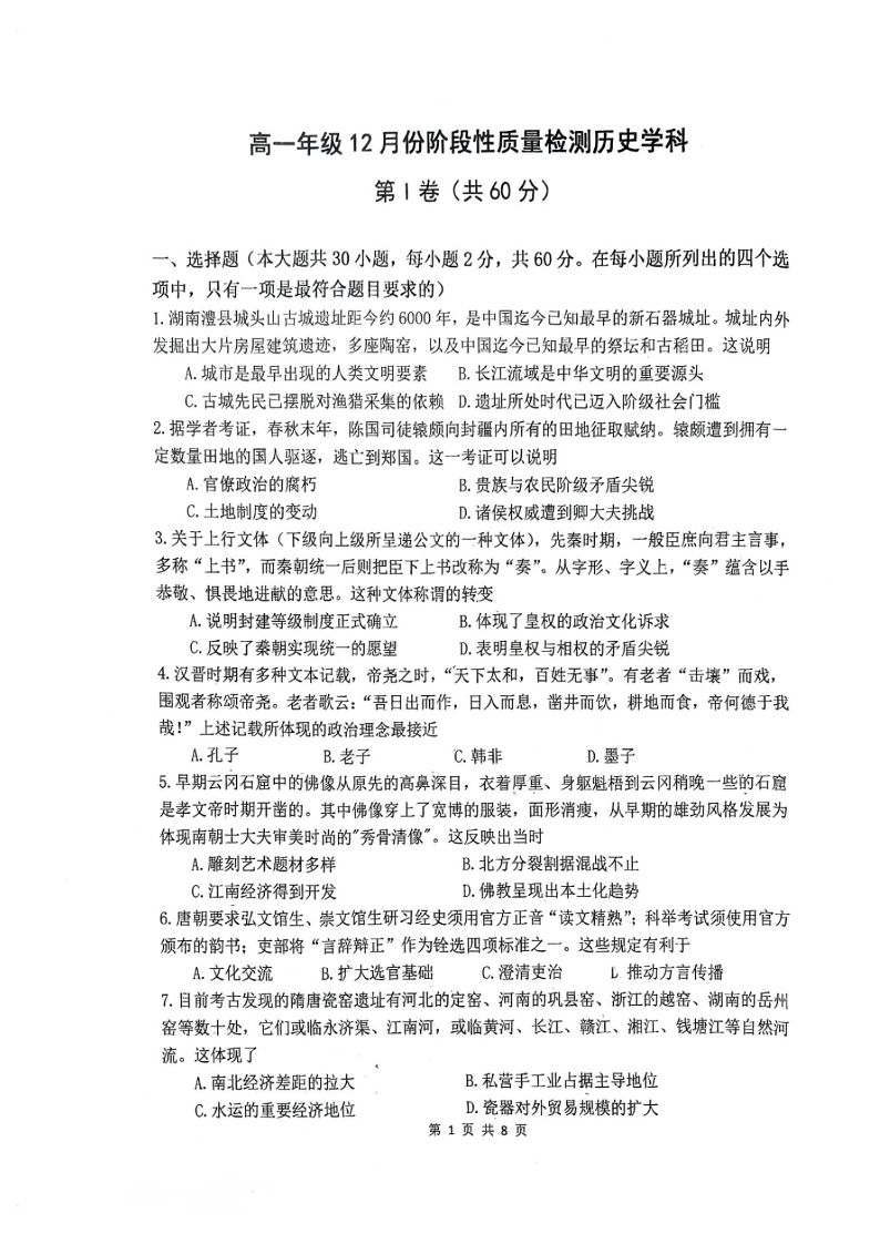 北京市海淀区首都师范大学附属中学2023-2024学年高一上学期12月月考历史