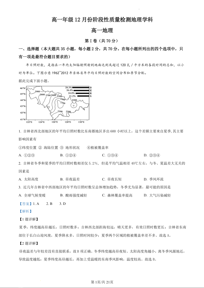北京市海淀区首都师范大学附属中学2023-2024学年高一上学期12月月考地理(精品解析版)