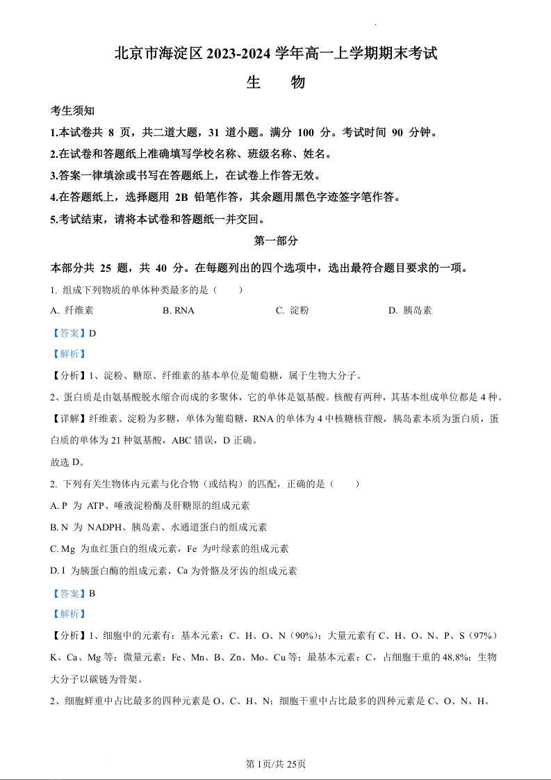 北京市海淀区2023-2024学年高一上学期期末考试生物(精品解析版)